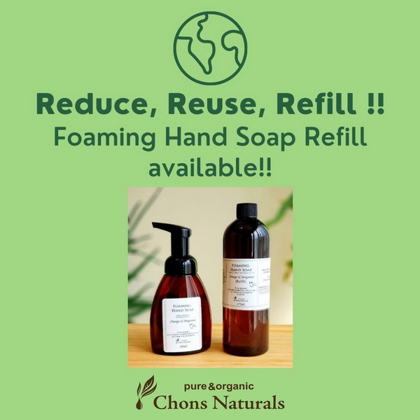 =================================Foaming Hand Soap Refills in 3 Scents470ml / $22.50https://www.chons.com/product-list/38================================= Reduce, Reuse, Refill !!Due to many requests, we have produced a refill for our Foaming Hand Soap!!The refill contains 470ml, which is more than double our regular size. =================================Our Foaming Hand Soap is a 100% Natural Pure Soap made with Certified Organic Botanicals.Free from synthetic chemicals, or SLS. Vegan & Cruelty Free (No Animal Testing), and 100% Biodegradable.Created with a gentle formula that will cleanse without over-drying and keep the skin clean, refreshed and smooth.================================= (Refill) Lavender & Geranium -Relaxing- Foaming Hand Soap470ml / $22.50https://www.chons.com/product/394 (Refill) Orange & Bergamot -Uplifting- Foaming Hand Soap470ml / $22.50https://www.chons.com/product/395 (Refill) Eucalyptus & Tea Tree -Refreshing- Foaming Hand Soap470ml / $22.50https://www.chons.com/product/396 Reduce plastic usage and save the planet!!